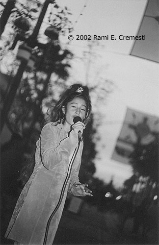My third photo of Guaida (Guaida I, Guaida II) and my first photo in black and white. This is a historical photo for me... Late March 2002, 3rd Street Promenade, Santa Monica. Guaida is a Haiwaiian 12 year old Gypsy that sings and makes roses from palm leaves on the 3rd street Promenade in Santa Monica. |