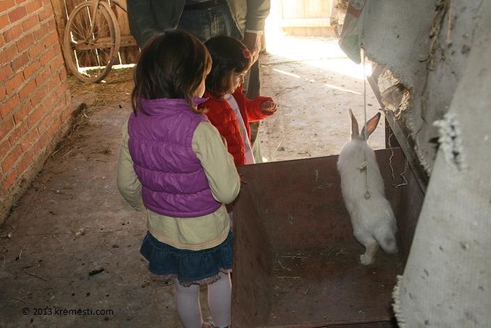 Lulu and Krassi checking out the bunnies at Bai Mincho Amerikanetsa's farm