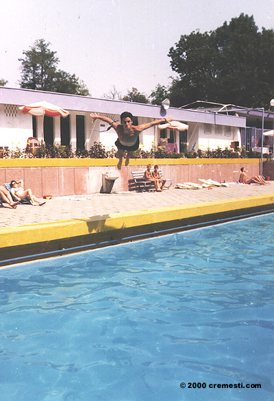 Photo by Hans Gründig Comments: Title: "Dive, Dive, Dive!". Comments: This is Rami Cremesti performing one of his all famous dives in a swimming pool in Plovdiv, Bulgaria. The place is called "Diveti Kilometar" which means "The Ninth Kilometer". This swimming resort is nine Kilometers outside downtown Plovdiv. The blue bandana hanging from Rami's right shoulder is used for "tightening" the muscle. The audience got their show as you can see in the photograph. You are lucky you are seeing mister Cremesti diving in shorts. The lifeguard had a hard time allowing him to swim in shorts. Speedos were "strictly enforced". |
