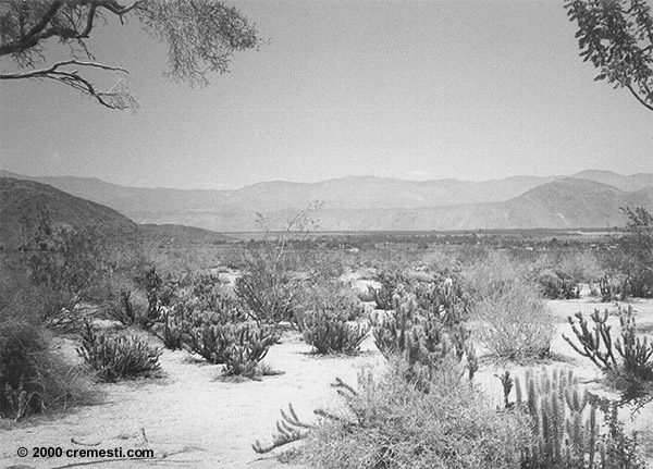 Credits: Young Ju, © 2000 cremesti.com Title: "Anza Borego Desert" Comments (by Rami E. Cremesti) A shot from our hiking trip to the Anza Borego Desert, San Diego County, Summer 2000. The tree you see closest to you as well as on the exrteme left, is the famous Smoke Tree. A 2 inch smoke tree can have roots up to several feet deep ! It takes strong, deep roots to survive harsh conditions... |