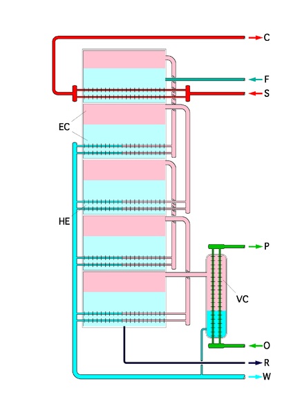 F - feed water in. S - heating steam in. C - heating steam out. W - Fresh water (condensate) out. R - brine out. O - coolant in. P - coolant out. VC is the last-stage cooler.