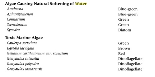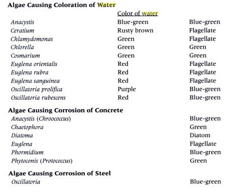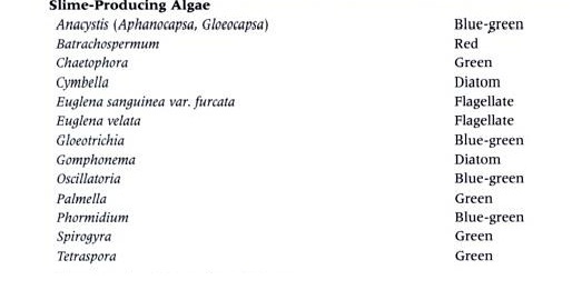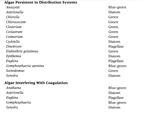 Algae Algae are primitive plants that have no true leaves, stems or root systems and reproduce by means of spores, cell division or fragmentation. About 17500 species of algae have been identified and there are probably many more. The four major groups of algae of interest in water treatment are blue green algae, green algae, diatoms and pigmented flagellates. Heavy concentrations of algae may cause the following operational problems in a water system: - Taste, odor and color - Toxicity - Filter clogging - Interference with Other Water Treatment Steps - Slime accumulation - Corrosion of Structures - Formation of THM's Below are the scientific names of various species of algae that cause problems in water treatment systems