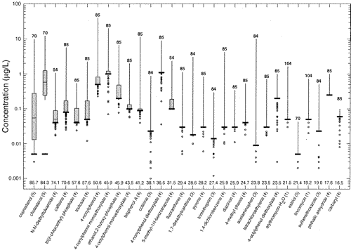 | Figure 2 Measured concentrations for the 30 most frequently detected organic wastewater contaminants. Boxplots show concentration distribution truncated at the reporting level. Estimated values below the reporting level are shown. Estimated maximum values for coprostanol and cholesterol obtained from Method 5 (Table 1) are not shown. The analytical method number is provided (in parentheses) at the end of each compound name. An explanation of a boxplot is provided in Figure 3. |
