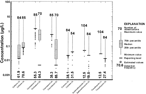 A large number of OWCs (82 out of 95) were detected at least once during this study (Table 1). Only eight antibiotics and five other prescription drugs were not detected in the samples analyzed (Table 1). Measured concentrations were generally low (median detectable concentrations generally <1 µg/L, Table 1), with few compounds exceeding drinking-water guidelines, health advisories, or aquatic-life criteria (Table 1). The concentration of benzo[a]pyrene exceeded its maximum contaminant level (MCL) of 0.2 µg/L at one site and bis(2-ethylhexyl)phthalate concentrations exceeded its MCL of 6.0 µg/L at five sites. In addition, aquatic-life criteria were exceeded for chlorpyrifos (Table 1) at a single site. However, many of the 95 OWCs do not have such guidelines or criteria determined (Table 1). In fact, much is yet to be known about the potential toxicological effects of many of the OWCs under investigation (1). For many OWCs, acute effects to aquatic biota appear limited because of the low concentrations generally occurring in the environment (24, 32-34). More subtle, chronic effects from low-level environmental exposure to select OWCs appear to be of much greater concern (1). Such chronic effects have been documented in the literature (34-38). In addition, because antibiotics are specifically designed to reduce bacterial populations in animals, even low-level concentrations in the environment could increase the rate at which pathogenic bacteria develop resistance to these compounds (15-17, 39).