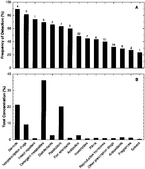 | Figure 4 Frequency of detection of organic wastewater contaminants by general use category (4A), and percent of total measured concentration of organic wastewater contaminants by general use category (4B). Number of compounds in each category shown above bar. |